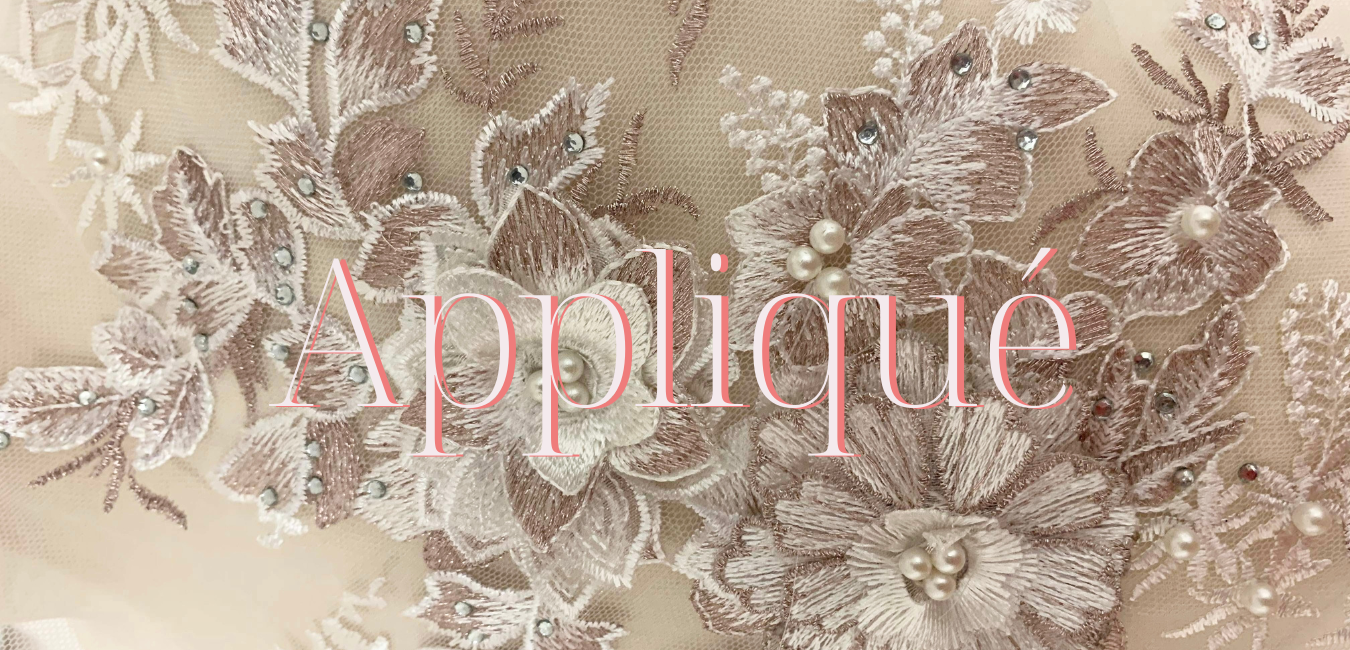 A Lace appliqué is an openwork fabric piece; the pattern is usually floral or botanical. It is sewn onto a net-like base such as tulle or mesh, made by twisting, looping, knitting threads.